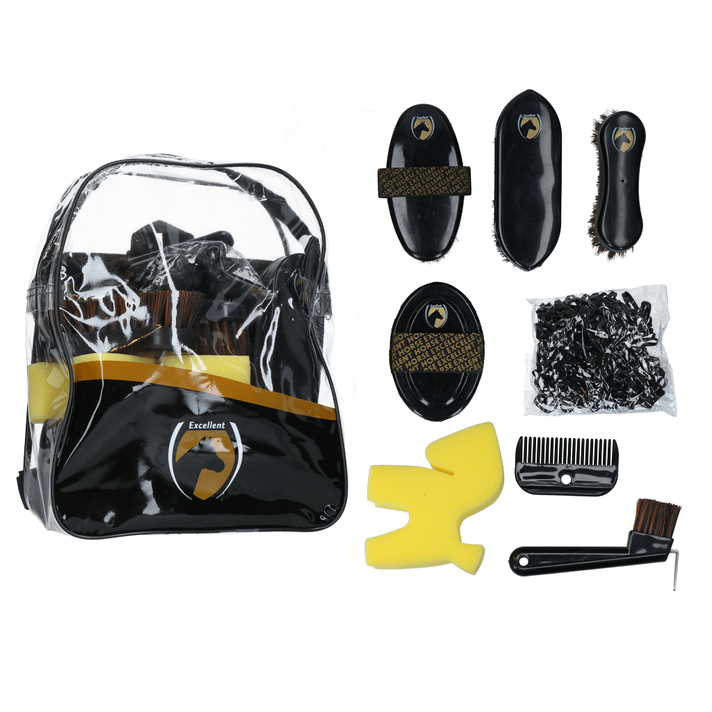 Complete verzorgingsset met rugtas, speciaal voor jonge ruiters! Deze set bevat alles voor het poetsen van de vacht, het kammen van de manen en het reinigen van de hoeven.