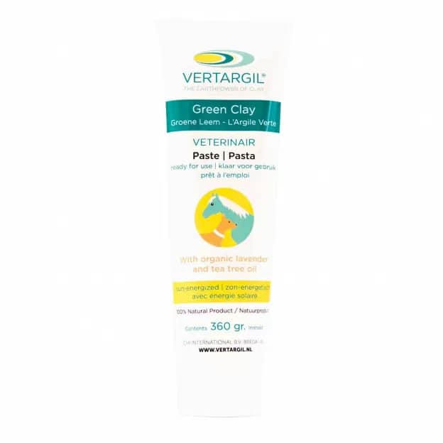 Groene klei pasta is uitstekend in te zetten als reinigend en huidherstellend middel voor huidproblemen bij dieren. Breng de pasta in een laag van 0,5 tot 1 cm dikte direct op de huid of aangedane plaats aan. Je kunt deze laag met verbandgaas of plastic folie op zijn plaats houden. Dagelijks één of meerdere malen de opgebrachte laag verwijderen en een nieuwe laag aanbrengen. Let op: laat stukjes klei die nog niet zijn ingedroogd vooral zitten, daar is de klei nog aan het werk.
